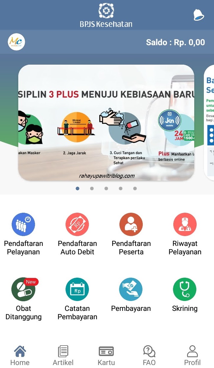 1. Klik tombol di kanan atas pada halaman muka aplikasi JKN, yang bertuliskan “Saldo, Rp 0.00”