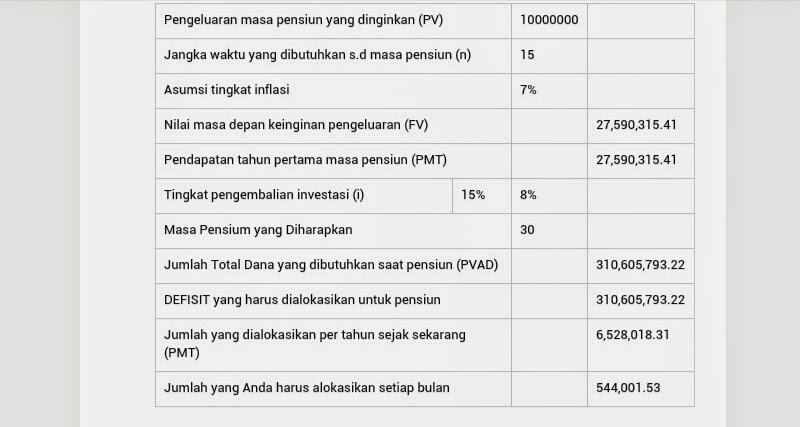 Ternyata jika saya merencanakan memiliki dana sebesar Rp10.000.000 guna biaya hidup sebulan pada masa pensiun saya nanti, maka saya harus menyisihkan dana sebesar Rp544.001.53 selama kurang lebih 15 tahun.