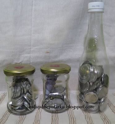 Oya, saya punya jenis tabungan lain, tabungan koin. Mula menabung si, sebetulnya tidak sengaja, hanya mengumpulkan koin sisa belanja. Tapi suatu kali si Hana merengek minta dibeliin lemari sendiri. Ga tahnya pas ngitung-ngitung, jumlah koin yang ada di botol-botol bekas sambel itu cukup untuk membeli satu lemari.
