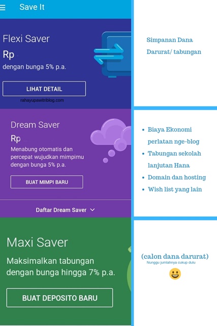 Dengan adanya fitur Saver dari Jenius, saya tinggal memasukkan alokasi biaya ekonomi peralatan, hosting/ domain ke dream saver, dan biaya sekolah lanjutan Hana ke Dream Saver. Sementara dana darurat masuk ke fitur Flexi Saver.