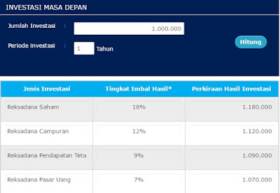 | Simulasi investasi reksadana di Danareksa (hanya simulasi, angka yang tertera bukan imbal balik nyata) |